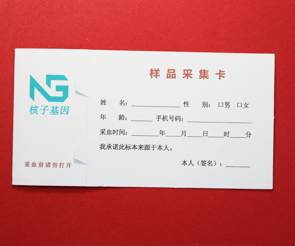 三環防汙染,樣品采集卡介紹: DNA 存儲卡(DNA血樣采集卡)是一種以植物纖維為載體用於存儲DNA的新型介質,專為室溫下對各種生物體液(如血液、精液、唾液)、細胞培養液、微生物、植物組織和病毒等樣品進行收集、運輸和存儲而設計。通過獨特的配方和生產工藝使該產品同時具有了蛋白質變性、細胞膜破裂、DNA吸附固定以及抑製細菌生長之功能,從而保證目標DNA在該存儲卡上存儲多年也不降低PCR效(xiao)率(lv),並(bing)且(qie)由(you)於(yu)蛋(dan)白(bai)質(zhi)的(de)變(bian)性(xing)使(shi)得(de)生(sheng)物(wu)樣(yang)品(pin)中(zhong)的(de)致(zhi)病(bing)微(wei)生(sheng)物(wu)或(huo)病(bing)毒(du)喪(sang)失(shi)活(huo)性(xing),避(bi)免(mian)了(le)對(dui)操(cao)作(zuo)人(ren)員(yuan)的(de)汙(wu)染(ran)危(wei)險(xian),同(tong)時(shi)也(ye)保(bao)證(zheng)了(le)長(chang)途(tu)運(yun)輸(shu)的(de)安(an)全(quan)。